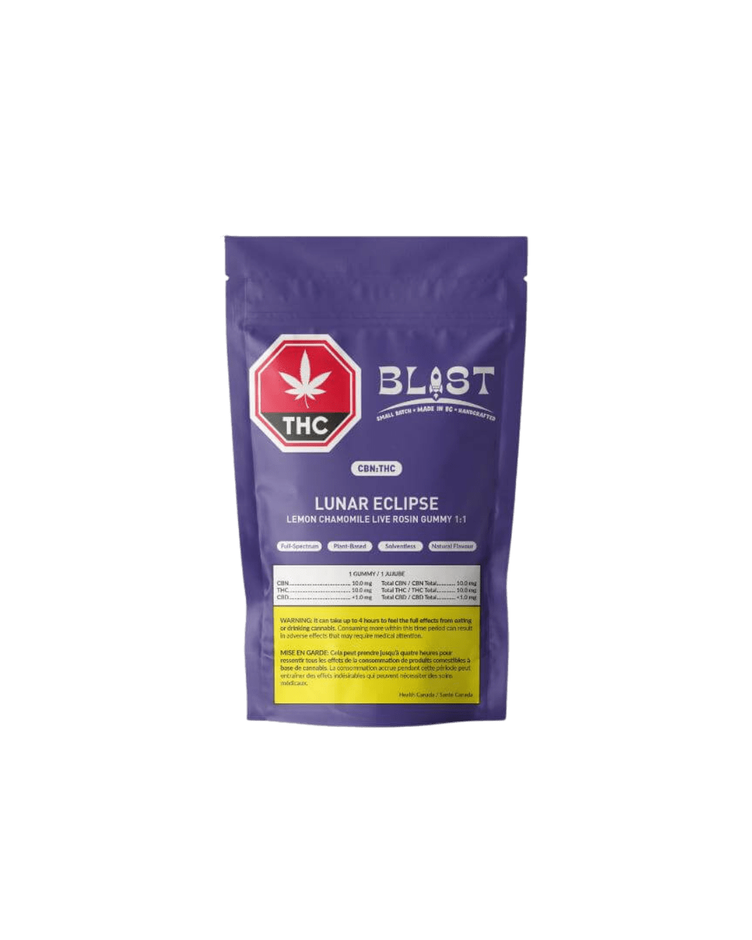 BC HALL OF FAME is an exclusive series by BLAST featuring gummies infused with full-spectrum solventless extracts from top BC micro cultivators. Drift into the tranquil embrace of Lunar Eclipse CBN:THC 1:1. As the moon rises and the stars shimmer overhead, indulge in the soothing blend of THC and CBN. Experience the tranquil blend of Lemon Chamomile, where the gentle taste of lemon harmonizes with soothing chamomile. Lemon's subtle citrus notes can help reduce stress and anxiety, promoting relaxation, while chamomile is well-known for its calming properties. This delightful combination not only tastes amazing but also sets the stage for a peaceful night's rest.